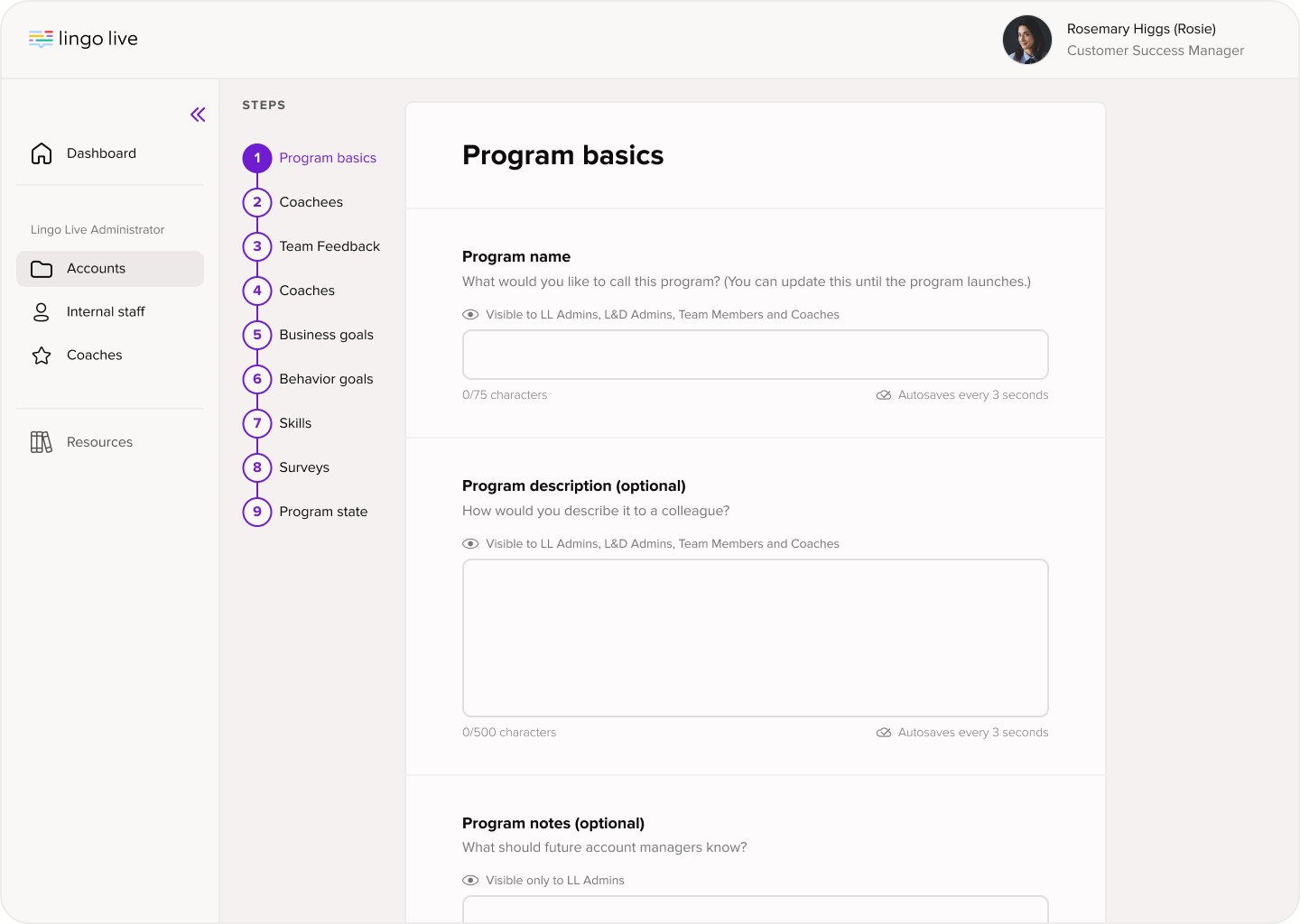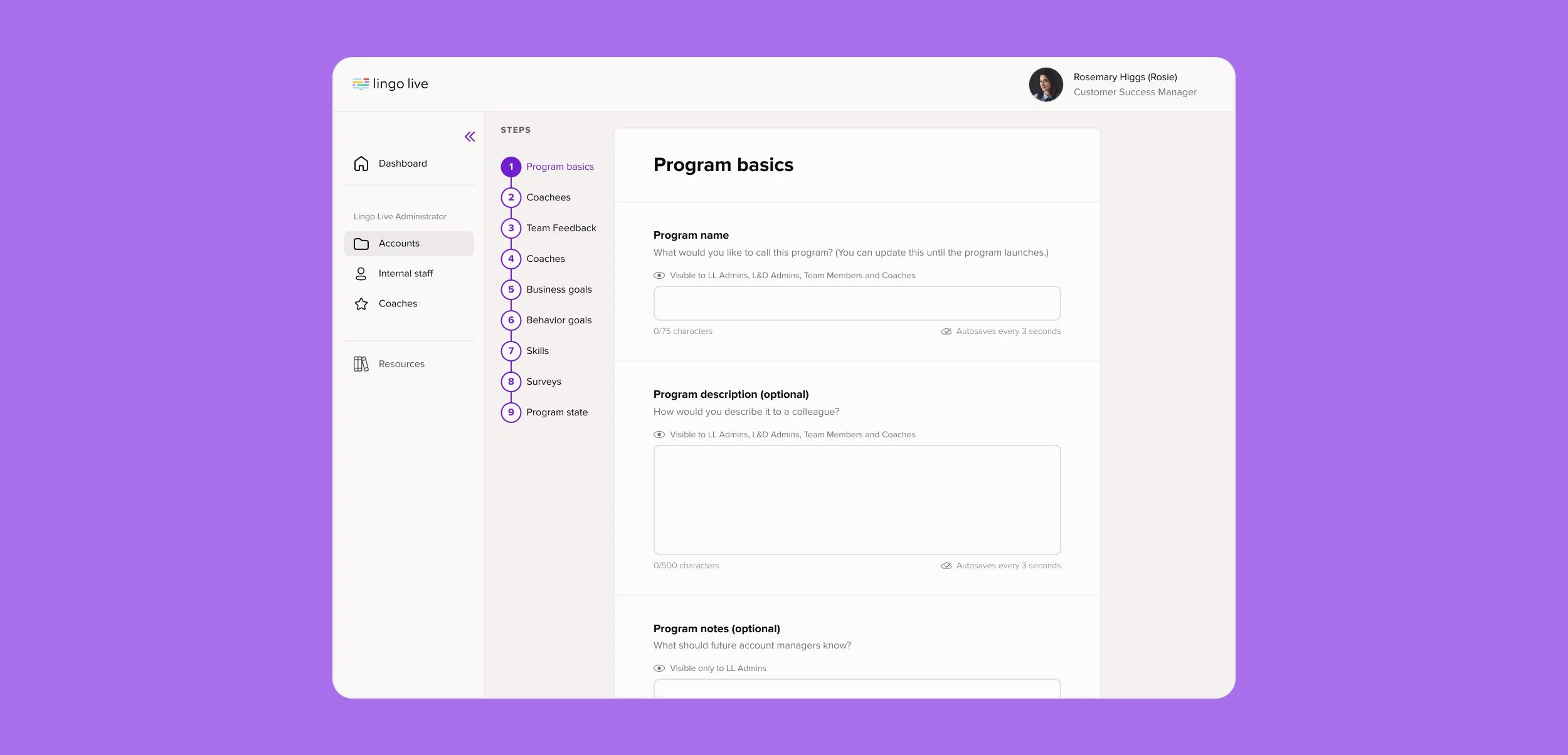 We introduced 5 main features: a program designer, survey builder, results pages, engagement pages, and a coachee notebook.